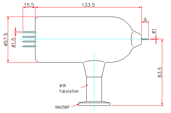 - Measurement Range : 1.0E-02Torr ~ 1.0E-10Torr - Mounting Position : Any, Vertical Pereferred - Collector : Tungsten, 0.005in dia - Cathode : Thoria Coated iridium or Dual tungstem - Grid : Refractory metals | |