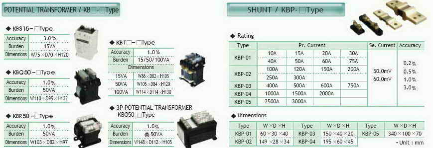TRANSFORMER / KB - Type Accuracy Burden Dimensions 3.0 15VA W75 D70 H120 Accuracy Burden Dimensions 1.0 50VA W110 D95 H132 SHUNT / KBP- Type Type KBP-01 KBP-02 KBP-03 KBP-04 KBP-05 Accuracy 0.2 0.5 1.0 3.0 Se. Current 50.0mV 60.0mV Pr. Current 10A 15A 20A 30A 40A 50A 60A 75A 100A 120A 150A 200A 250A 300A 400A 500A 600A 750A 1000A 1500A 2000A 2500A 3000A Rating Accuracy Burden 1.0 15/50/100VA W86 D82 H105 W105 D84 H120 W114 D114 H130 Dimensions Accuracy Burden Dimensions 1.0 50VA W103 D82 H97 Type W D H Type W D H Type W D H KBP-01 60 30 40 KBP-03 150 40 20 KBP-05 340 100 70 KBP-02 149 28 34 KBP-04 195 60 45 Dimensions Accuracy Burden Dimensions 1.0 50VA W148 D112 H105 3P POTENTIAL TRANSFORMER KBO50- Type 15VA 50VA 100VA Unit : mm