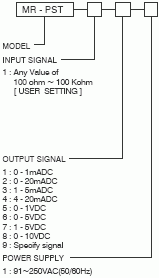 FEATURES Small size(mm) : 83(H), 51(W), 102(D). Isolation : input to output to power supply. Power supply : AC or DC supply. Wiring : terminal socket wiring. Case & color : black ABS plastic case. Weight : about 400g MR - PST INPUT SIGNAL SPECIFICATION OUTPUT SIGNAL SPECIFICATION Output voltage signal : 12VDC max. Output voltage impedance : 2Kohm min. Output voltage noise : 10mV p-p max. Output current signal : 30mADC max. Output load resistance : 750ohm max. Output current noise(250ohm load) : 10mV p-p. GENERAL SPECIFICATION'S Operating ambient temperature : 0 - 50'C. Non operating ambient temperature : -20 ~ 80'C. Temperature coefficient : 0.015%/'C. Operating ambient humidity : 90% RH max.(non condensing) Insulation resistance : greater than 100Mohm with 500VDC. Dielectric strength : 1500VAC @ 1minute (input to output to power). Adjustment range : 20% (zero & span) min. Conversion accuracy : 0.2% max. Response time : 0 - 90%(0.5sec). Burnout circuit : upscale(standard).