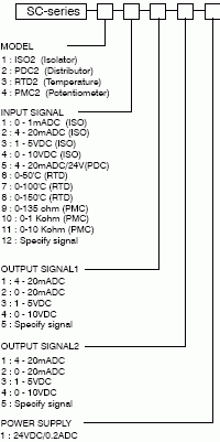 OUTPUT SIGNAL SPECIFICATION Output voltage signal : 12VDC max. Output voltage impedance : 2Kohm min. Output voltage noise : 10mV p-p max. Output current signal : 30mADC max. Output load resistance : 750ohm max. Output current noise(250ohm load) : 10mV p-p. GENERAL SPECIFICATION'S Operating ambient temperature : 0 - 50'C. Non operating ambient temperature : -20 ~ 80'C. Temperature coefficient : 0.02%/'C Operating ambient humidity : 90% RH max.(non condensing) Insulation resistance : greater than 100Mohm with 500VDC. Dielectric strength : 1500VAC @ 1minute (input to out1 to out2 to power). Adjustment range : 20% (zero & span) min. Conversion accuracy : 0.2% max. Response time : 0 - 90%(0.5sec). OUTPUT SIGNAL1 1 : 4 - 20mADC 2 : 0 - 20mADC 3 : 1 - 5VDC 4 : 0 - 10VDC 5 : Specify signal Slim ty pe SIGNAL ISOLATION CONVERTER (2output) 1 : 0 - 1mADC (ISO) 2 : 4 - 20mADC (ISO) 3 : 1 - 5VDC (ISO) 4 : 0 - 10VDC (ISO) 5 : 4 - 20mADC/24V(PDC) 6 : 0-50'C (RTD) 7 : 0-100'C (RTD) 8 : 0-150'C (RTD) 9 : 0-135 ohm (PMC) 10 : 0-1 Kohm (PMC) 11 : 0-10 Kohm (PMC) 12 : Specify signal SC-ISO2 Input voltage signal : -300 ~ 300VDC Input voltage impedance : 1Mohm min. Input current signal : 30mADC max. Input current load resistance : 100ohm max.(at 20mA) 1 : ISO2 (Isolator) 2 : PDC2 (Distributor) 3 : RTD2 (Temperature) 4 : PMC2 (Potentiometer) POWER SUPPLY 1 : 24VDC/0.2ADC 1 : 4 - 20mADC 2 : 0 - 20mADC 3 : 1 - 5VDC 4 : 0 - 10VDC 5 : Specify signal SC-PDC2 Input current signal : 30mADC max. Input current load resistance : 100ohm max.(at 20mA) External power source : DC22~26V/30mA Max. SC-RTD2 Input type : 2wire or 3wire Input signal : pt50,100,1000 ohm or Ni,cu. Input range : -200 ~ 600 'C EXT current : 1.5mA/5VDC> SC-PMC2 Input type : 2wire or 3wire Input signal : potentiometer Input range : 100 ohm ~ 2 Mohm. EXT power : 5VDC FEATURES Small size(mm) : 75(H), 22.5(W), 100(D)-at on DIN rail. Wiring : Terminal wiring. Case & color : gray Polyamide UL 94.V2. Weight : about 100g. POWER SUPPLY SPECIFICATION Power source : DC voltage. Power range : DC24V/200mA max.