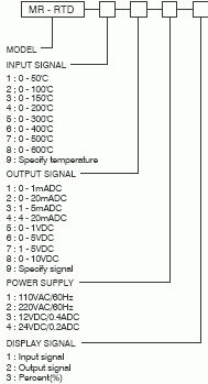 FEATURES Small size(mm) : 83(H), 51(W), 102(D). Isolation : input to output to power supply. Power supply : AC or DC supply. Wiring : terminal socket wiring. Case & color : black ABS plastic case. Weight : 400g. INPUT SIGNAL SPECIFICATION OUTPUT SIGNAL SPECIFICATION Output voltage signal : 12VDC max. Output voltage impedance : 2Kohm min. Output voltage noise : 10mV p-p max. Output current signal : 30mADC max. Output load resistance : 750ohm max. Output current noise(250ohm load) : 10mV p-p. GENERAL SPECIFICATION'S Operating ambient temperature : 0 - 50'C. Non operating ambient temperature : -20 ~ 80'C. Temperature coefficient : 0.015%/'C. Operating ambient humidity : 90% RH max.(non condensing) Insulation resistance : greater than 100Mohm with 500VDC. Dielectric strength : 1500VAC @ 1minute (input to output to power). Adjustment range : 20% (zero & span) min. Conversion accuracy : 0.2% max. Response time : 0 - 90%(0.5sec). Burnout circuit : upscale(standard). Linearity : 0.2% max. OUTPUT IMPEDANCE OUTPUT LOAD - R 0 - 1VDC 0 - 5VDC 1 - 5VDC 0 - 10VDC 0 - 1mA 0 - 20mA 1 - 5mA 4 - 20mA > 1Kohm > 2Kohm > 2Kohm > 4Kohm < 15Kohm < 750ohm < 3Kohm < 750ohm Input type : 3wire type. Input signal Pt50ohm or Pt100ohm Input range : -200 ~ 600'C. EXT Power : 1.5mA/5VDC. This is a converter to convert to DC signal from the RTD temperature sensor. This is equipped with a linear type of compensation circuit and compensates for non-linear error of the sensor, and enables perfect signal conversion not affected by withstand insulation voltage, transfer speed and noise, etc by adopting precision isolation circuits. MODEL & SPECIFICATION CODE MODEL INPUT SIGNAL 1 : 0 - 50'C 2 ; 0 - 100'C 3 : 0 - 150'C 4 : 0 - 200'C 5 : 0 - 300'C 6 : 0 - 400'C 7 : 0 - 500'C 8 : 0 - 600'C 9 : Specify temperature OUTPUT SIGNAL 1 : 0 - 1mADC 2 : 0 - 20mADC 3 : 1 - 5mADC 4 : 4 - 20mADC 5 : 0 - 1VDC 6 : 0 - 5VDC 7 : 1 - 5VDC 8 : 0 - 10VDC 9 : Specify signal POWER SUPPLY 1 : 110VAC/60Hz 2 : 220VAC/60Hz 3 : 12VDC/0.4ADC 4 : 24VDC/0.2ADC MR - RTD DISPLAY (OPTION) Type : 3 digit FND Display font : red super bright Display function's : input or output or percent(%). Display error : 1digit(LSB). DISPLAY SIGNAL 1 : Input signal 2 : Output signal 3 : Percent(%)