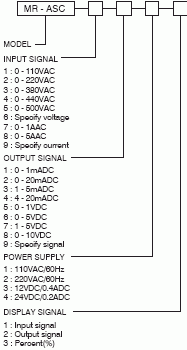 FEATURES Small size(mm) : 83(H), 51(W), 102(D). Isolation : input to output to power supply. Power supply : AC or DC supply. Wiring : terminal socket wiring. Case & color : black ABS plastic case. Weight : about 400g MR - ASC INPUT SIGNAL SPECIFICATION OUTPUT SIGNAL SPECIFICATION Output voltage signal : 12VDC max. Output voltage impedance : 2Kohm min. Output voltage noise : 10mV p-p max. Output current signal : 30mADC max. Output load resistance : 750ohm max. Output current noise(250ohm load) : 10mV p-p. GENERAL SPECIFICATION'S Operating ambient temperature : 0 - 50'C. Non operating ambient temperature : -20 ~ 80'C. Temperature coefficient : 0.015%/'C. Operating ambient humidity : 90% RH max.(non condensing) Insulation resistance : greater than 100Mohm with 500VDC. Dielectric strength : 1500VAC @ 1minute (input to output to power). Adjustment range : 20% (zero & span) min. Conversion accuracy : 0.2% max. Response time : 0 - 90%(0.5sec). OUTPUT IMPEDANCE OUTPUT LOAD - R 0 - 1VDC 0 - 5VDC 1 - 5VDC 0 - 10VDC 0 - 1mA 0 - 20mA 1 - 5mA 4 - 20mA > 1Kohm > 2Kohm > 2Kohm > 4Kohm < 15Kohm < 750ohm < 3Kohm < 750ohm Input signal : 500Vac or 5Aac max. Input signal loss : 0.5VA. Operating range : 0 - 110%. Permissible over range : 200% 1minute. This is a convererter used to convert to DC signal by using input signal source of AC signal. Correct signal transfer without noise is enabled with built-in filter circuits. DISPLAY (OPTION) Type : 3 digit FND Display font : red super bright Display function's : input or output or percent(%). Display error : 1digit(LSB). DISPLAY SIGNAL 1 : Input signal 2 : Output signal 3 : Percent(%)