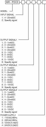 FEATURES Small size(mm) : 83(H), 51(W), 102(D). Isolation : input to output to power supply. Power supply : AC or DC supply. Wiring : terminal socket wiring. Case & color : black ABS plastic case. Weight : about 400g MR - PDC3 INPUT SIGNAL SPECIFICATION OUTPUT SIGNAL SPECIFICATION Output voltage signal : 12VDC max. Output voltage impedance : 2Kohm min. Output voltage noise : 10mV p-p max. Output current signal : 30mADC max. Output load resistance : 750ohm max. Output current noise(250ohm load) : 10mV p-p. GENERAL SPECIFICATION'S Operating ambient temperature : 0 - 50'C. Non operating ambient temperature : -20 ~ 80'C. Temperature coefficient : 0.015%/'C. Operating ambient humidity : 90% RH max.(non condensing) Insulation resistance : greater than 100Mohm with 500VDC. Dielectric strength : 1500VAC @ 1minute (input/out1/out2/power). Adjustment range : 15% (zero & span) min. Conversion accuracy : 0.2% max. Response time : 0 - 90%(0.5sec). OUTPUT IMPEDANCE OUTPUT LOAD - R 0 - 1VDC 0 - 5VDC 1 - 5VDC 0 - 10VDC 0 - 1mA 0 - 20mA 1 - 5mA 4 - 20mA > 1Kohm > 2Kohm > 2Kohm > 4Kohm < 15Kohm < 750ohm < 3Kohm < 750ohm Input current signal : 30mADC max. Input current load resistance : 100ohm max.(at 20mA) External power source : DC24V/30mA max. OUTPUT SIGNAL1 1 : 0 - 1mADC 2 : 0 - 20mADC 3 : 1 - 5mADC 4 : 4 - 20mADC 5 : 0 - 1VDC 6 : 0 - 5VDC 7 : 1 - 5VDC 8 : 0 - 10VDC 9 : Specify signal 3 OUTPUT ISOLATION POWER DISTRIBUTOR OUTPUT SIGNAL3 1 : 0 - 1mADC 2 : 0 - 20mADC 3 : 1 - 5mADC 4 : 4 - 20mADC 5 : 0 - 1VDC 6 : 0 - 5VDC 7 : 1 - 5VDC 8 : 0 - 10VDC 9 : Specify signal