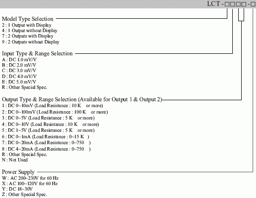 -(power) W : AC 200~230V for 60 Hz X : AC 100~120V for 60 Hz Y : DC 18~30V Z : Other Special Spec. ORDERING INFORMATION Specify code number and variables. - Code no. : LCT-Model/Input/Output1/Output2-Power (Ex : LCT-4C8N-X) - Special Input Range (Ex. 10mV/V) - Special Output Range (Ex. 0~20mA) GENERAL SPECIFICATIONS - Housing Material : Plastic ABS(Resin) Black - Isolation : Input to Output to Power - Adjustment : Zero & Span(Separation) 10% of F.S - Display : 3 digits INSTALLATION - Power Supply : AC 100~120V or 200~230V / 60Hz (about 3VA), DC 18~30V (about 3Watts) - Operating Temperature : -5 ~ +55 C - Operating Humidity : 90% RH max. (Non-condensing) - Mounting : Wall or Rail mounting (Plug-in Type) - Dimension : 52(W) X 77(H) X 112(D) (Unit : mm) - Weight : about 400g PERFORMANCE - Accuracy : 0.1% LESS(F.S) at 23 C - Temperature Coefficient : 0.015% / C - Response Time : 0.5 Sec or less (0~90%), Normal - Changeable Range : DC 1 ~ 6 mV/V - Insulation Resistance : 100 MW or more with 500V DC between Input / Output / Power - Dielectric Strength : 1500V AC 0.5 mA/Min (Input to Output to Power) - Display Range : -99 to 999 (Available Decimal Point) - Unit : %, V, A, mV, mA, etc. SCHEMATIC CIRCUIT & CONNECTION DIAGRAM
