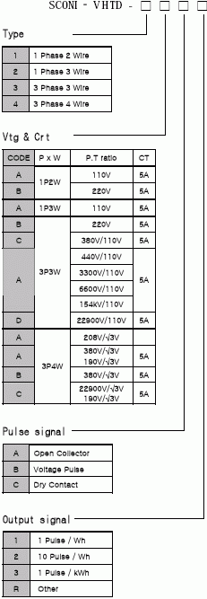 Order information SCONI – V H TD - □ □ □ □ Type Vtg & Crt Pulse signal Output signal Item Specification Power Supply AC 110V/220V ± 15% Tolerance 0.5 % FS Response Time 0.4 sec(0 ~ 90%) Ripple 0.25% p_p Max Temperature Coefficient 0.015% / ℃ Output Range -10 ~ 120% Output Adjust Range Zero : Less than 5% Span : Less than 15% Dielectric Strength AC 1500V/min(Ext terminal/Case) Isolation 100㏁ or more(DC 500V) Shock Voltage 1.2/50usec 5kV Shock 30G, 3 axial, 3 times(JISCO912) Vibration 5 ~ 55Hz 6G, 3 axial, 2 hrs(JISCO911) Operating Temperature 0 ~ 55℃ Operating Humidity 20 ~ 80% RH Dimension W 75 x H 150 x D 113 1 1 Phase 2 Wire 2 1 Phase 3 Wire 3 3 Phase 3 Wire 4 3 Phase 4 Wire CODE P x W P.T ratio CT A 110V 5A B 1P2W 220V 5A A 1P3W 110V 5A B 220V 5A C 380V/110V 5A 440V/110V 3300V/110V 6600V/110V A 154kV/110V 5A D 3P3W 22900V/110V 5A A 208V/√3V A 380V/√3V 190V/√3V 5A B 380V/√3V 5A C 3P4W 22900V/√3V 190V/√3V 5A General This model inputs voltage and current of electric power facilities by use of transducers, converts operated ineffective power value into pulse signal. 1 1 Pulse / Wh 2 10 Pulse / Wh 3 1 Pulse / kWh R Other A Open Collector B Voltage Pulse C Dry Contact