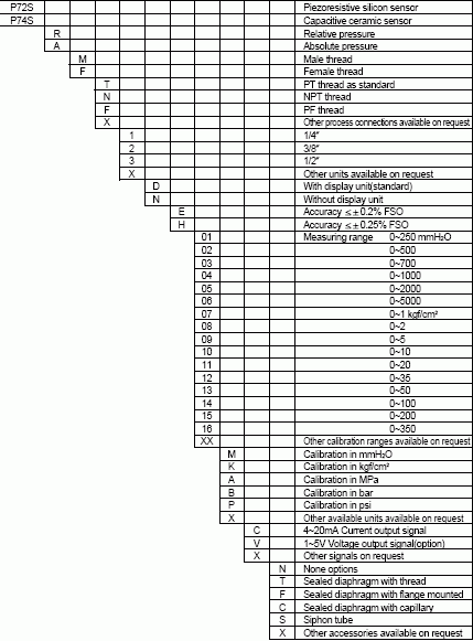 Model P72S P74S Technology Piezoresistive silicon pressure sensor Capacitive ceramic pressure sensor Pressure ranges 0~0.1 to 350kgf/cm2 relative pressure 0~250mmH20 to 70kgf/cm2 relative 0~1 to 350kgf/cm2 absolute pressure 0~1 to 70kgf/cm2 absolute Pressure reference Gauge, absolute, vacuum and compound Overload 3×full scale without damage 6×full scale without damage Current output signal 4~20mA DC 2-wire technique Voltage output signal 1~5V DC 3-wire technique Other output signal available on request Local display LED 31/2 digit Excitation voltage 12~36V DC Load resistance max@24V 500Ω at 24V Influence of excitation 0.01% FSO/V Power ripple ≤500mV P-P Reverse polarity Protected Shock resistance No change in performance after 10Gs for 11ms Vibration 0.1G (1 m/s/s) maximum Response time(10~90%) ≤2 milliseconds 1 milliseconds Adjustment ±10% FSO/zero and span ±20% FSO/zero and span Accuracy ≤±0.25% FSO ≤±0.2% FSO Non-linearity ±0.100% FSO typical ±0.15% FSO Repeatability ±0.015% FSO typical ±0.10% FSO Pressure hysteresis ±0.010% FSO typical ±0.10% FSO Long term stability ±0.3% FSO over 6 month Max. annual error ±0.10% FSO Cutoff frequency(-3 d B) ≤2kHz Reference temperature 35°C 25°C Operating temperature range -40~125°C -40~125°C Compensated temperature range 0~82°C -20~80°C Thermal sensitivity shift ≤±0.2%FSO in reference to 35°C typical ≤±0.05%FSO Thermal zero shift ≤±0.2% FSO in reference to 35°C typical ≤±0.1%FSO Thermal hysteresis ≤±0.1% FSO in reference to 35°C typical ≤±0.1%FSO Process connection PT1/4″, PT3/8″, PT1/2″male thread PF1/4″, PF3/8″, PF1/2″male thread Other connections available on request Process media Compatible with stainless steel 316 Ceramic Al2 O3, 96% Materials wetted by process Diaphragm : Stainless steel 316L Ceramic Al2 O3, 96% Housing : Aluminum Die-casting Gasket O-ring : Viton (HNBR, CSM, etc.) Enclosure rating IP65 Explosion protection Ex d IIC T6 Influence of mounting position Under 0.5kgf/cm2, mounted vertically Not critical Weight Approx.(802g) Options Sealed diaphragm with thread connection Sealed diaphragm with flange mounting Siphon tube Sealed diaphragm with capillary Note : ① For high pressure measurement, this model is available up to 2000kgf/cm2 with thin film pressure sensor. ② If it is installed in explosive atomosphere, the covers should be kept tight when circuit alive.