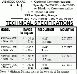 FEATURES Simple push-button calibration (Accurate) Output 4-20 mA / 20-4mA (Isolated on 4 Wire Model’s only ) Optional RS232 OR RS485 communications with calibration, diagnostics & data logging software PLC compatible (Modbus RTU) Three or four Wire Operation APPLICATIONS Food and Beverages Water / Wastewater Chemicals with vapors Solids Ranges Approx. 1/2 of liquids MECHANICAL Conduit Entry 1/2” NPT Enclosure Aluminum Or Stainless Steel - 94V0 Ingress Protection NEMA 4 (IP65) ENVIRONMENTAL Temperature - 40 to 140°F (- 40 to 60°C) Installation Category Class II Approvals FCC Part 15 - Low Power Communication Device 730 The Kingsway Peterborough , Ont. K9J6W6 Canada Tel: (705) 740 — 2010 Web: www.abmsensor.com Fax: (705) 740 — 2563 E-mail: info@abmsensor.com PROCESS Temperature PP Rod - 40 to 190°F (- 40 to 90°C) PTFE Rod - 40 to 300°F (- 40 to 149°C) Material Dielectric Єr >2 Pressure 1-10 bar 15-150 psi OPERATIONAL Operation Pulse Radar Accuracy +/- 0.1% of max. range in lab using 4-20mA current output +/-0.25% of max. range (typically in field ) Frequency 6.3 GHz Loss of Echo Hold 30 seconds, 22mA output Time Transmitter Power 50 uW average Calibration Push-button or programmable via optional communications port. Diagnostics (Echo Profile) via communications port Antenna Dielectric rod (PP, & Optional PTFE) ELECTRICAL SPECIFICATIONTECHNICAL SPECIFICATIONS S Self Adjusting “Smart” Radar Level Measurement Sensors MODEL RANGE In Liquids RESOLUTION MOUNTING ABM300 - 050R 3 Wire - DC * - 50 ft. * - 15 m 0.22” 5.7 mm 2.0” NPT ABM300 - 100R 3 Wire - DC * - 100 ft. * - 30 m 0.44” 11 mm 2.0” NPT ABM400 - 050R 4 Wire - AC * - 50 ft. * - 15 m 0.22” 5.7 mm 2.0” NPT ABM400 - 100R 4 Wire - AC * - 100 ft. * - 30 m 0.44” 11 mm 2.0” NPT Note - * Minimum Distance starts at the lower tip of the antenna . 750 Ohms (Isolated on 4 Wire only) 115 VAC 60 Hz or 230 VAC 50 Hz (+/-20%) , 1.7 VA DC AC Power 12 to 30 VDC , 0.07 A max @ 24 Vdc R load = (Vs — 6) / 24 mA Output 4-20 mA Output 6.1 uA resolution Optional RS232 or RS485 communications port. 10A 305 R4 2” NPT ABMXXX-XXXRC = Optional Communications - Specify 2=RS232 or 4=RS485 or Blank no Communication R = Radar 6.3 GHz XXX = Operating Range 400 = AC Power , 300 = DC Power